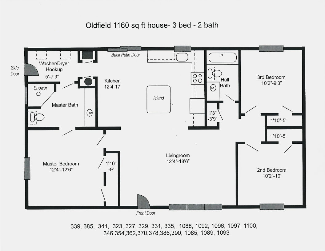 346, 354, 362, 370,378, 386, 390, 1085, 1089, 1093 | Oldfield Village | $1069 | 1160 | 3 | Y | Y | Y | Y | H/U | Y | Y | Y | Y | 4 | B | P | Y | 2 | Yes | Y | House | ||||||||
