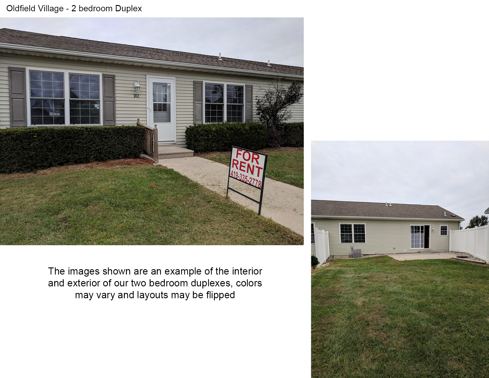 All of the rental units have high efficiency gas heat, central air and heat, range, refrigerator, built in dishwasher, disposal, washer dryer hookup private yard, patio or deck. This is the best rental housing available in the Wauseon area. Houses range in price from $709 to $999 monthly. 960 ft² duplexes are $659 and 1080 ft² duplexes $719. Units have high efficiency gas heat, central air and heat, range, refrigerator, built in dishwasher, disposal, washer/dryer hookup, private yard, and either a patio or deck. Pets are allowed in all homes; however, please check the restrictions and additional fee listed in the pet addendum. Refuse is included in the monthly rent. Check the table below for all the features at Oldfield Village.